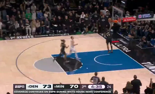 第三节比赛中,戈贝尔抢断约基奇接球,多森姆反击砍下26分追至1分打停掘金。